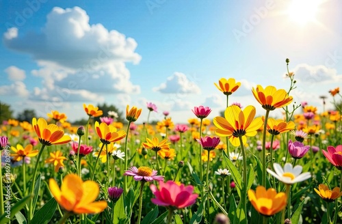 wildflower, flower, field, spring, summer, nature, colourful, bloom, landscape, sunlight, bright, sky, cloud, garden, flower petals, park, flora, growth, beauty, rural, environment, sunny, vibrant, biodiversity, meadow, blossom, wildlife, serenity, peaceful, scenery, plant, sunshine, fresh, botanical, scenic, cheerful, greenery, blue skies, horizon, natural beauty, sunny day, joy, calmness, scenic view, fresh air