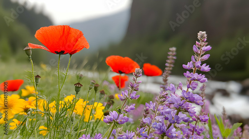 flower, flower, wildflower, wildflower, bloom, blooming, blossom, blossom, flower petals, red, orange, yellow, purple, violet, green, stem, stem, leaf, leaf, field, meadow, grass, nature, plant, plant, wild, flora, environment, beauty, scenic, tranquil, detail, vibrant, summer, spring, outside, water, river, flowing, blurry, bokeh, background, landscape, mountain, daylight