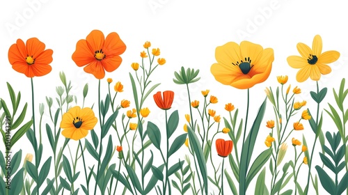 wallpaper, foliage, design, textured, vibrant, meadow, decorative, summer, orange, yellow, illustration, colourful, botanical, element, border, spring, garden, springlike, detailed, high-coloured, blossom, pattern, nature, green, plant, aesthetic, natural, delicate, flower