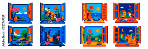 Colorful window scenes depicting different times of day and varying landscapes with vibrant flowers and cozy interiors