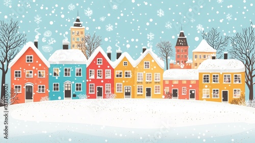 Colorful Winter Landscape with Snowy Houses in a Quaint Village Scene