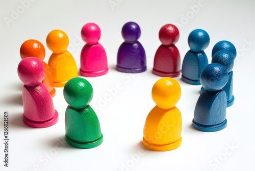 Colorful Wooden Figures Arranged in a Circle on a White Background
