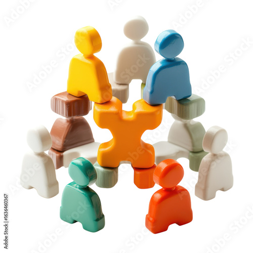 Colorful wooden figures supporting a puzzle piece, symbolizing teamwork, collaboration on transparent background