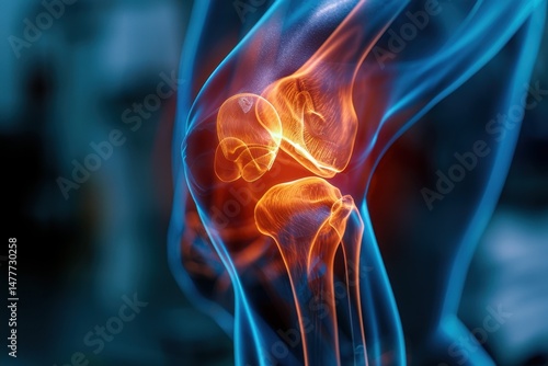 Colorful X-ray image of a human knee joint highlighting bones and joints.