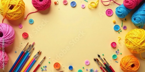 Colorful Yarn, Buttons, and Paintbrushes Arranged on a Pastel Yellow Background for Creative Projects