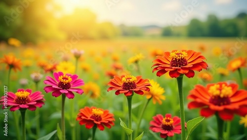 Colorful zinnia flowers swaying in a sunny meadow, sunflowers, nature, meadow