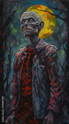 Colorful Zombie Painting, Full Moon, Haunted Forest, Dark Humor, Generative AI