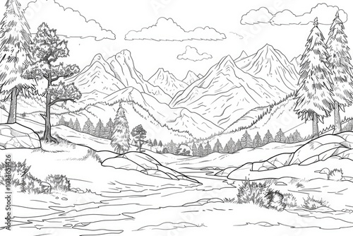 colouring, book, illustration, snowy, landscape, mountain, tree, winter, art, drawing, nature, scenery, holiday, serene, peaceful, creativity, children, fun, entertainment, adventure, vignetting, design, activity, white, blue, pine, graphic, print, lifestyle, beauty