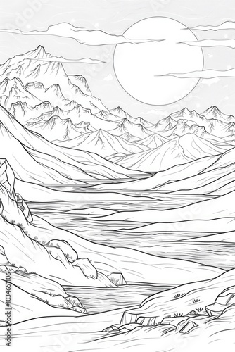 Coloring book illustration of a winter landscape at sunset featuring beautiful snow covered mountains