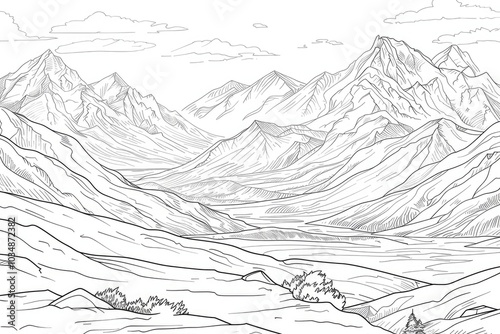 Coloring book illustration of snow covered mountains and scenic landscape from an elevated perspective