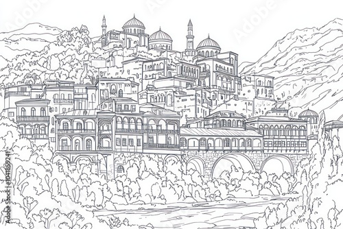 coloring page for adults, in a cartoon style, old Tbilisi, on a white background, fine lines