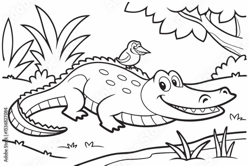 coloring page for kids, a cartoon crocodile sunbathing on a river bank, smiling with its mouth slightly open, a little bird is sitting on its back, thick outlines, black and white