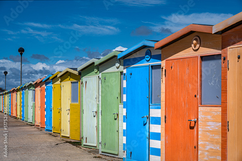 Colourful beach huts at the promenade at Seaford in East Sussex.