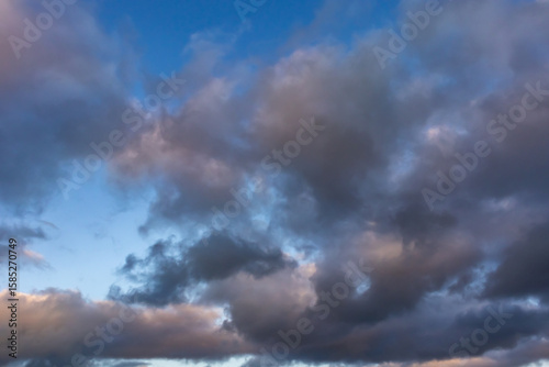Colourful evening sky with dramatic clouds and patches of blue during sunset