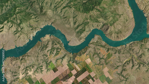 Columbia River meanders and Lake Roosevelt National Recreation Area, looking down aerial view from above – Bird’s eye view Columbia River, Washington, USA