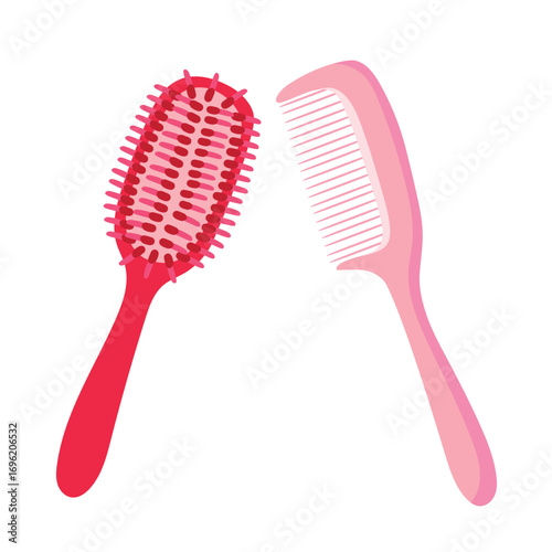 Comb hair brush, pink and red colors. Flat vector clipart, illustration with isolated background.