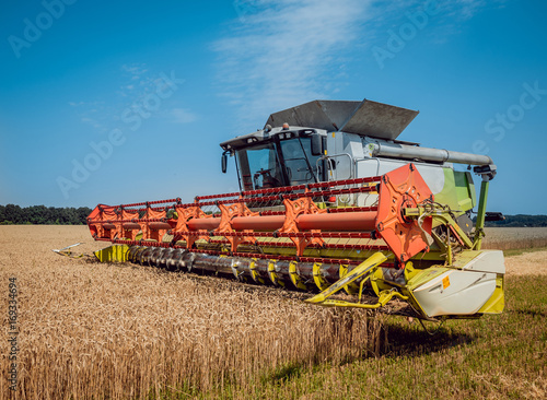 Combine harvester in action on wheat field. Process of gathering a ripe crop.