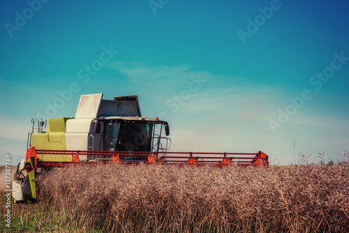 harvester, harvesting, field, red, wheat, seed, oat, soybean, straw, grain, agriculture, bar, machinery, yellow, flax, farm, conveyer, season, cutter, rotary, crop, threshing, concave, gold, land, thresher, cumulus, drum, ripe, tank, barley, tailings, ear, merging, agronomy, maize, engine, cloud, impeller, flaxseed, blue, ultramarine, chopper, machine
