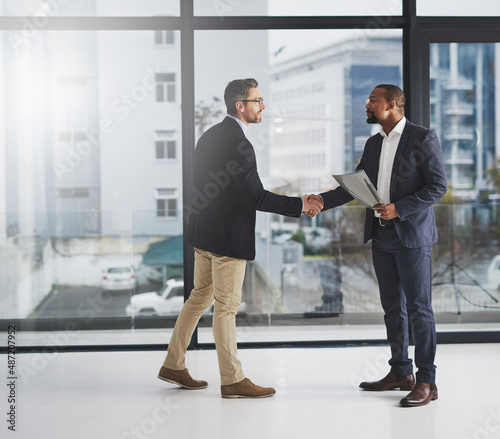 Combining corporate talent. Shot of two businessmen shaking hands at work.