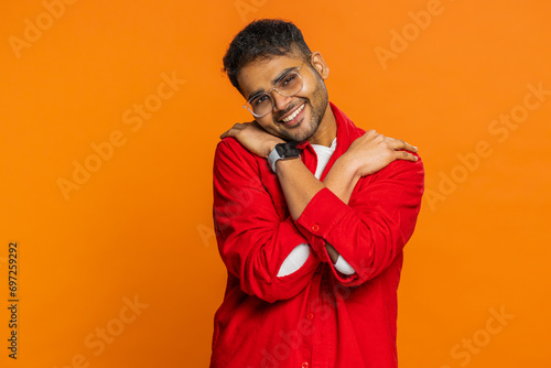hug, man, love, hugs, smile, proud, happy, indian, care, satisfied, good, respect, positive, friends, welcome, invite, hallo, self, amazed, greeting, ego, comfortable, esteem, pride, glad, gesture, support, mimic, assessment, peaceful, posture, congratulation, excitement, success, joyful, isolated, studio, indoor, arabian, hindu, guy, young adult, male, advertisement, copy space, boy, hispanic, muslim