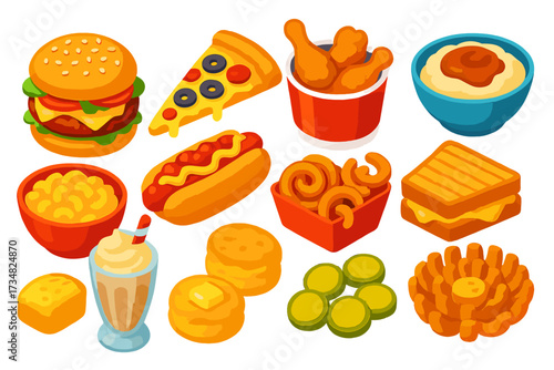 comfort, food, icon, isometric, vector, illustration, set, fast, loaded, burger, patty, pizza, slice, with, olive, fried, chicken, bucket, mashed, potato, gravy, macaroni, cheese, bowl, chili, dog, curly