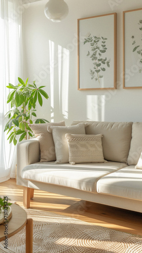 Comfortable modern sofa, soft luxury couch in cozy living room minimal elegant aesthetic home interior design contemporary style background space. House furniture store shopping advertising promo .