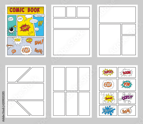 comic book Blanks set, text speech bubbles , Comic magazine cover Template, strip page mock up