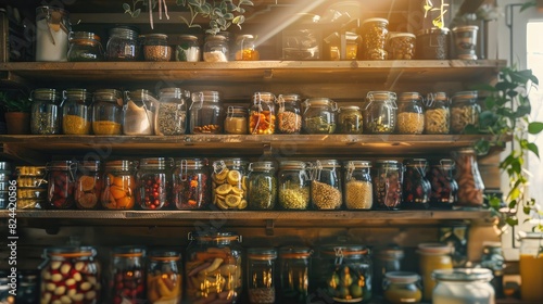 commercial photo, close-up, pantry goods, bottom view, soft light