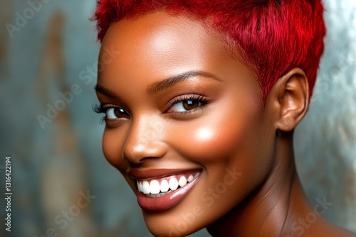 Commercial promotion creative art. Attractive smiling black girl - for ads, advertisement and web banner use. Short hairdo - red hair. Black model shoot. Black girl style. Artistic black ads.