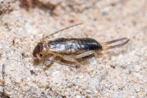 Common earwig, Forficula auricularia, walking on a rock on a sunny day. High quality photo