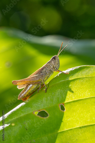 Common field grasshoper sitting on a green leaf macro photography in summertime. Common field grasshopper sitting on a plant in summer day close-up photo. Macro insect on a green background.