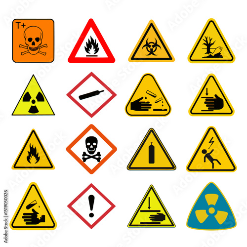 signs, warning, danger, icon, symbol, hazard, safety, vector, set, road, caution, yellow, triangle, illustration, traffic, radiation, biohazard, attention, flammable, signs, voltage, isolated, toxic, laser, chemical