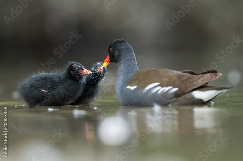Common Moorhen - Teichhuhn - Gallinula chloropus ssp. chloropus, Germany (Baden-Württemberg), adult with youngsters