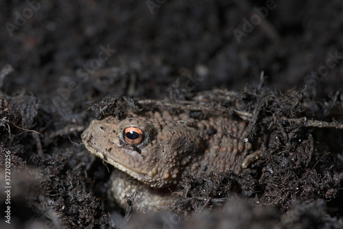 toad, face, hiding, muddy, compost, vibrant, camouflage, natural, habitat, environment, macro, closeup, copy space, looking, eye, catch, light, bright, orange, portrait, nose, mouth, lumpy, wild, amphibia, common, european, amphibian, garden, animal, nature, warty, rough, bumpy, full body, full frame, eye, brown, black, mud, dirtied, earth, debris, texture, red, hidden