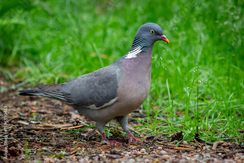 common wood pigeon stands alert on the forest floor surrounded by green vegetation and fallen leaves