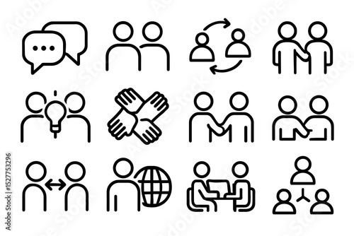 Communication and collaboration icons: teamwork, idea sharing, global interaction
