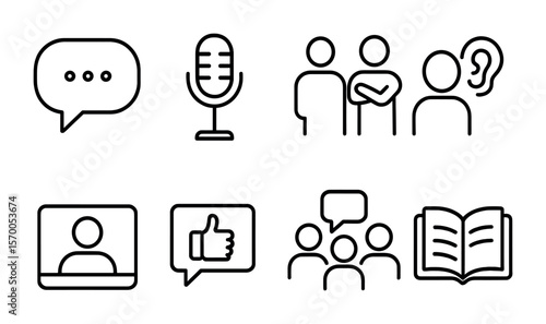 communication, icon, set, outline, vector, skill, speech, bubble, microphone, body, language, active, listening, video, call, feedback, icon, group, chat, storytelling, book