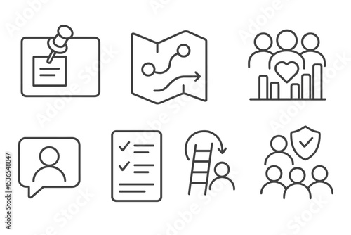 community, icon, collection, line, style, notice board, pin, icon, strategy, map, open, invitation, group, pulse, chart, member, story, bubble, shared, value, list, step, teamwork, trust, text
