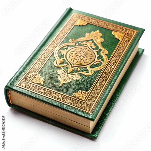 koran, compact, green, imitation leather, cover, gold, foil, arabic, calligraphy, closed, position, spine, visible, matte, texture, isolated, studio, product, faith, religion, islam, spiritual, minimal, clean