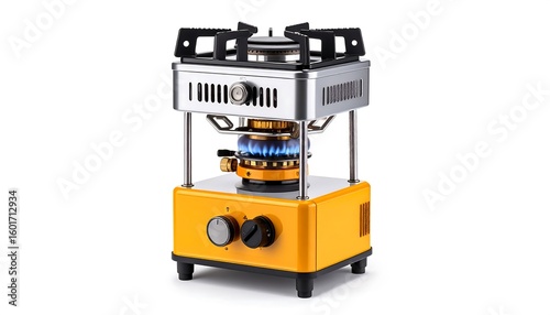 portable, stove, gas, cooking, kitchen, camping, flames, heat, burner, yellow, orange, metal, silver, modern, design, small, compact, appliance, equipment, fuel, energy, technology, instrument, device, functional, efficient, lightweight, hard-wearing, accurateness, safe, adjustable, control, precise, power, burner, hot, regulation, ergonomic, quality