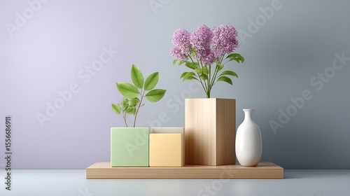 Compact workspace for creatives, Minimalist arrangement of green plants and purple flowers in pastel-colored and wooden vases on a light wooden shelf against a soft lavender wall.
