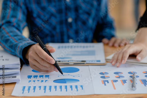 Company meeting room has businessmen and finance managers meeting together on finance topics, they are looking at information on documents and discussing together. Concept company financial management