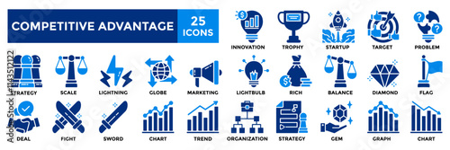 Competitive advantage icon collection set. Containing strategy, innovation, marketing, target, trend icon. Simple black flat vector illustration
