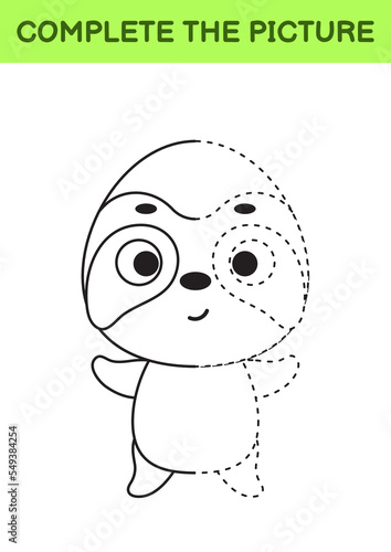 Complete drawn picture of cute sloth. Coloring book. Dot copy game. Handwriting practice, drawing skills training. Education developing printable worksheet. Activity page. Vector illustration