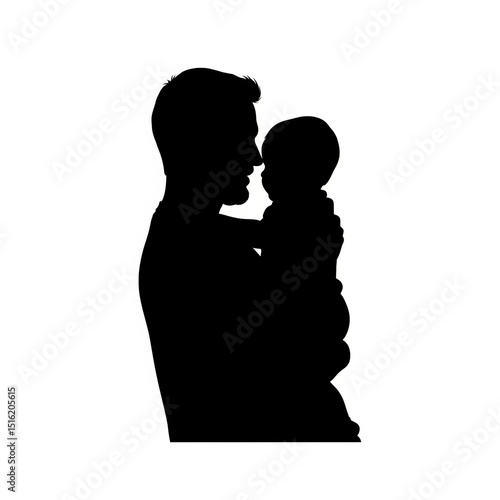 Completely black silhouette of father holding child in arms isolated on pure white background