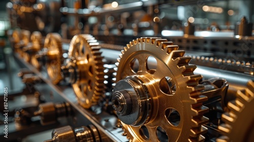 Complex cogwheel system, polished metallic surfaces gleaming, demonstrating precise engineering and smooth motion, in a modern industrial scene
