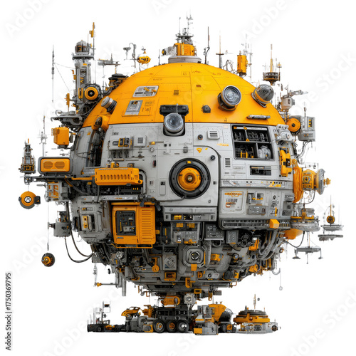 sphere, mechanical, complex, machine, yellow, white, grey, structure, system, pipe, wire, detail, technology, futuristic, geometric, pattern, design, concept, artificial, robot, automation, engineering, industrial, metallic, round, model, artwork, digital, creation, object, illustration, part, assembly, circuit, energy, powered, connected, section, abstract, element, component, mechanism, science, fiction, gizmo, contraption, apparatus