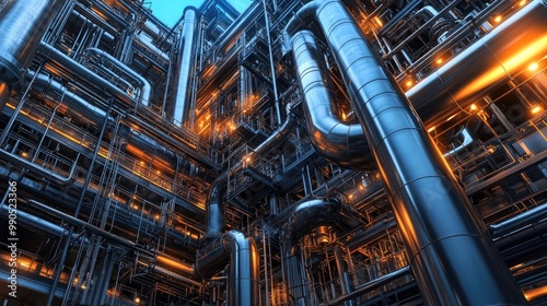 industry, factory, pipe, steel, metal, infrastructure, production, manufacturing, refinery, machinery, industrial, engineering, construction, technology, process, automation, energy, power, complex, intricate, network, grid, tube, connection, pipeline, system, equipment, futuristic, urban, modern, abstract