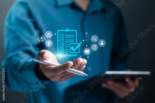Compliance rules and law regulation policy concept. Businessman holding compliance icons on virtual screen for enforcement of laws, regulations, and standards.