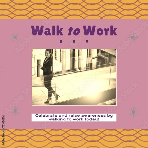Composition of walk to work day text over caucasian businesswoman at office on pink background
